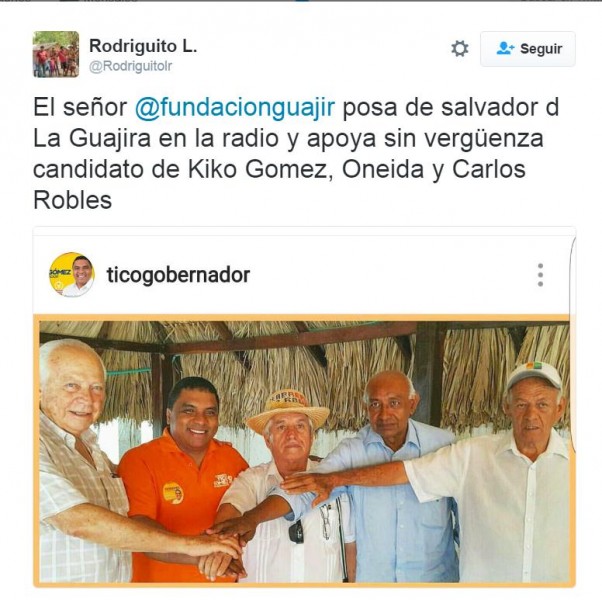 El voto por el Plebiscito se convirtió en una puja anticipada entre los dos candidatos que aspiran a la gobernación de La Guajira el próximo 6 de noviembre. Los exgobernadores Juan Francisco ‘Kiko’ Gómez –detenido e investigado por homicidio y nexos con bandas- y la destituida Oneida Pinto, -acusada de tentativa de homicidio- ambos electos por Cambio Radical, quienes estaban con el No, apoyan al candidato Norberto Tico Gómez; mientras el grupo del congresista Alfredo Deluque, principal promotor del Sí está con el candidato Wilmer Gonzáles. Con la candidatura de Tico Gómez están también el Congresista Liberal Antenor Durán –cercano a Kiko Gómez- y Carlos Robles, el rector de la Universidad de La Guajira, uno de los nuevos poderes políticos del departamento y quién ha sabido utilizar la influencia política desde las aulas en la capital Rioahca y en todo el departamento.