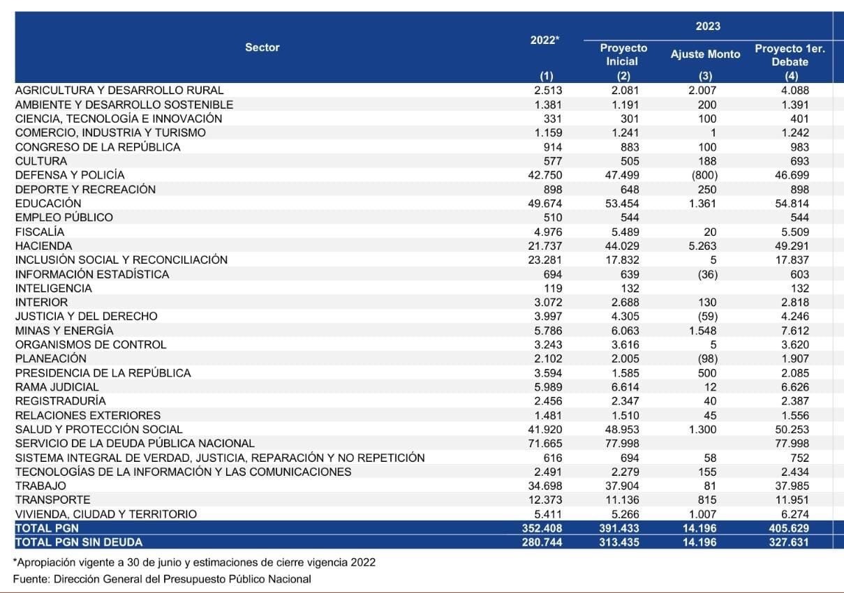 En comparación con la promovida en su momento por el gobierno Duque, la de Petro la supera en $14,19 billones. De esta adición, $10,2 billones se destinarán a programas sociales y subsidios, y $3,9 millones se han pensado para funcionamiento. Según las cuentas del Ministerio de Hacienda, de todo el monto estimado, $254,6 billones se destinarán a funcionamiento, $73 billones a inversión y $78 billones al servicio de la deuda.