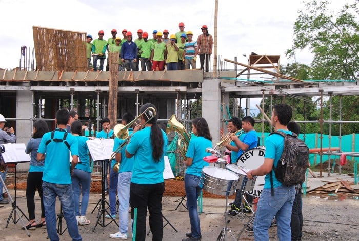 Los constructores del edificio fueron los papás de muchos de los alumnos que iban a darles conciertos para animar el trabajo.