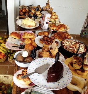 Detrás de la mesa están los maestros: Julia y Sebastián. Ella siempre con una sonrisa inocente y una pañoleta en la cabeza y él mucho más osado, se acerca al cliente y le da la bienvenida con un beso y un abrazo, lo conozca de antes o no. Tienen dos ayudantes, cuya presencia y ayuda es imprescindible. Si ya es amigo de la familia de Les Amis, entre a la cocina, salude de beso a los cuatro, pregunte qué están haciendo y hasta lávese las manos, póngase un delantal, cúbrase el pelo y ayude. Si es su primera vez y el pudor no le permite hacer mi primera recomendación, escoja el plato que más le guste, sírvase lo que le apetezca y lleve la cuenta de lo que se come en la mente porque esta pastelería hace un especial homenaje a la honestidad. Nadie está pendiente de quién se lleva qué de la mesa.
