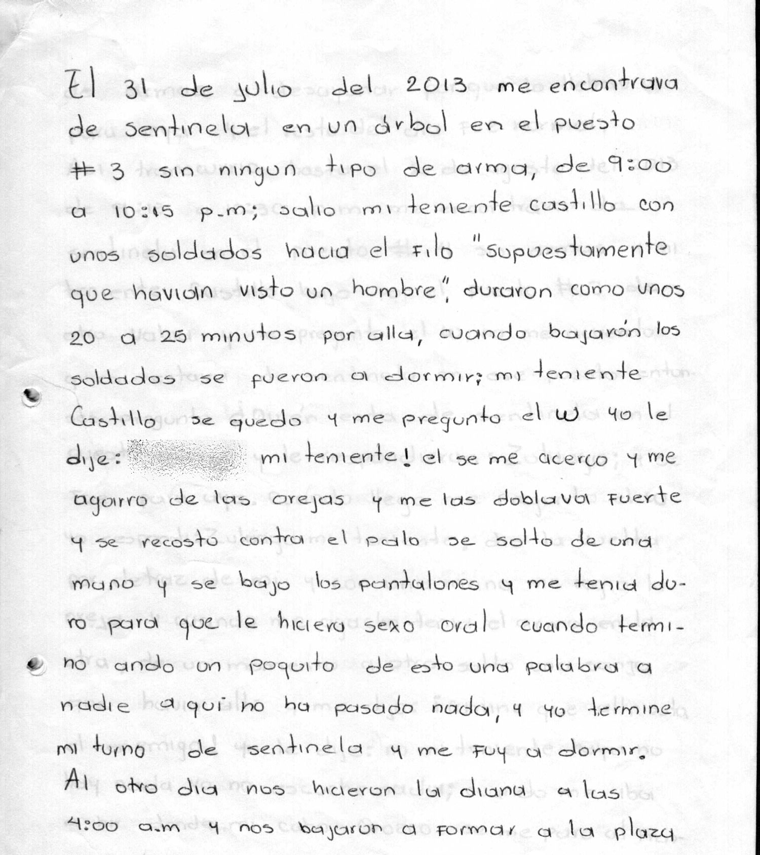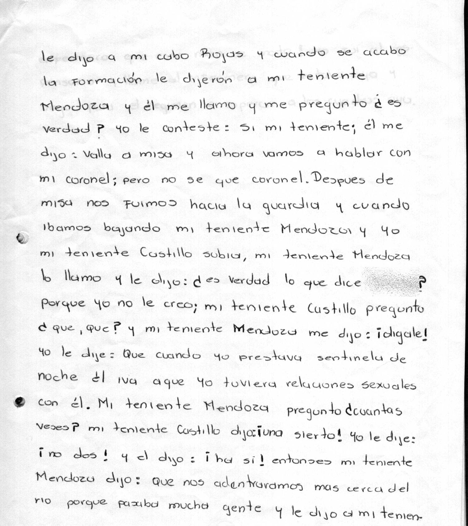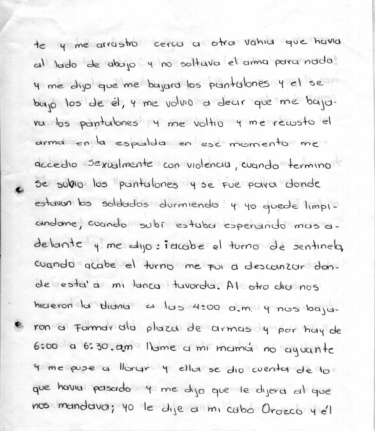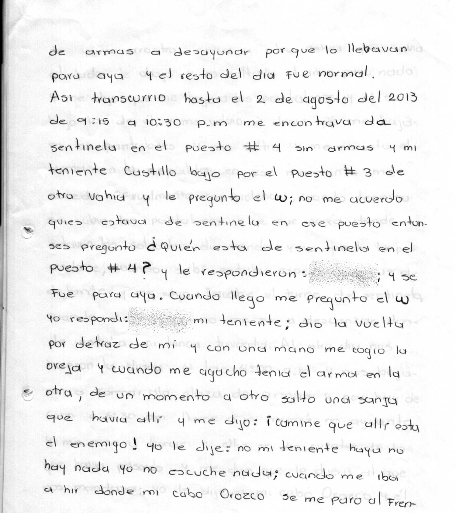 El 31 de julio del 2013 me encontraba de centinela en un árbol en el puesto número 3 sin ningún tipo de arma, de 9 : 00 a 10:15 pm; salió mi teniente Castillo con unos soldados hacia el filo “supuestamente que habían visto a un hombre”; duraron como unos 20 a 25 minutos allá. Cuando bajaron los soldados, se fueron a dormir; mi teniente Castillo se queda y me preguntó mi w y yo le dije ¡Zamora teniente!, el se acercó y me agarró de las orejas y me las doblaba fuerte y se recostó contra el palo, se soltó de una mano y se bajó los pantalones y me tenía duro para que le hiciera sexo oral, cuando terminó andó un poquito y dijo de esto ni una palabra a nadie, aquí no ha pasado nada, y yo terminé mi turno de centinela y me fui a dormir. Al otro día nos hicieron la diana a las 4 am y nos bajaron a formar a la plaza de armas y a desayunar y el resto del día fue normal. Así transcurrió hasta el día 2 de agosto del 2013 de 9:15 a 10:30 pm, me encontraba de centinela en el puesto número cuatro, sin armas y mi teniente Castillo bajó desde el puesto número tres de otra bahía y preguntó el w; no me acuerdo quien estaba de centinela en ese puesto, entonces preguntó ¿quién está de centinela en el puesto número cuatro? Y le respondieron Zamora mi teniente; dio la vuelta por detrás de mí y con una mano me cogió la oreja y cuando me agachó tenía el arma en la otra, de un momento a otro saltó a una zanja que había allí y me dijo ¡camine que ahí está el enemigo! Yo le dije no mi teniente, allá no hay nada, yo no escuché nada; cuando me iba a huir a donde el cabo Orozco se me paró al frente y me arrastró a otra bahía que había del lado de abajo. No soltaba el arma para nada y me dijo que me bajara los pantalones y me volteó y me recostó el arma en la espalda en ese momento me accedió sexualmente con violencia, cuando terminó se subió los pantalones y se fue para donde estaban los soldados durmiendo y yo quedé limpiándome, cuando subí estaba esperando más adelante y me dijo: ¡acabe el turno de centinela! Cuando acabé me fui a descansar donde estaba mi lanza Tavorda. Al otro día nos hicieron la diana a las 4 am y nos bajaron a formar a la Plaza de Armas y por ahí de 6:00 a 6: 30 bajé llamar a mi mamá, no aguanté y me puse a llorar y ella se dio cuenta de lo que había pasado. Me dijo que le dijera a quien nos mandaba, yo le dije a mi cabo Orozco y él a mi teniente Rojas y cuando se acabó la formación le dijeron a mi teniente Mendoza y él me llamo y me preguntó ¿es verdad? Y yo le contesté sí, mi teniente; él me dijo vaya a misa, ahora vamos a hablar con mi coronel. Después de misa nos fuimos a la guardia y cuando íbamos bajando, mi teniente Castillo subía. Mi teniente Mendoza lo llamó y le dijo ¿es verdad lo que dice Zamora? Porque yo no le creo, mi teniente Castillo preguntó ¿qué , qué? Y mi teniente Mendoza me dijo dígale, yo le dije cuando yo prestaba centinela de noche; él iba para que yo tuviera relaciones sexuales con él. Mi teniente Mendoza preguntó ¿cuántas veces? Mi teniente Castillo dijo, una ¿cierto?, yo le dije no, ¡dos! Y él dijo ¡ahh sí! ; entonces mi teniente Mendoza dijo que nos adelantáramos más cerca del río porque pasaba mucha gente y le dijo a mi teniente Castillo ¡esto tengo que informarle a mi coronel! mi teniente Castillo dijo ¡No, yo lo informo!, mi teniente Mendoza dijo bueno ¡hágalo rápido! Y él pensó treinta segundos y al fin lo llamó y cuando colgó nos dijo: que lo llamara dentro de diez minutos que estaba ocupado de ahí se fue para detrás de una piedra que estaba allí y mi teniente Mendoza y lo llamaba y le decía ¡Castillo venga! Y volvió y lo llamó ¡Castillo venga! Y le dijo ¡Castillo deme el arma! Y el teniente Castillo dijo no es para tanto y se puso a orinar una mata y mi teniente Mendoza también se puso a orinar dándole la espalda al teniente Castillo ; cuando terminó mi teniente Mendoza se dirigió hacia mí y se sentó en una silla táctil que yo tenía mirándome a mí y dándole la espalda al teniente Castillo me dijo : “vaya y cárgueme el celular al régimen y espéreme allá que ya yo voy. Cuando llevaba si mucho cien metros, escuché un disparo y mi teniente Mendoza gritó, ¡enfermero, que este man se mató! Yo fui al inspensario y llamé al enfermero que estaba allá y seguí para el régimen a esperar a los cuadros allá.