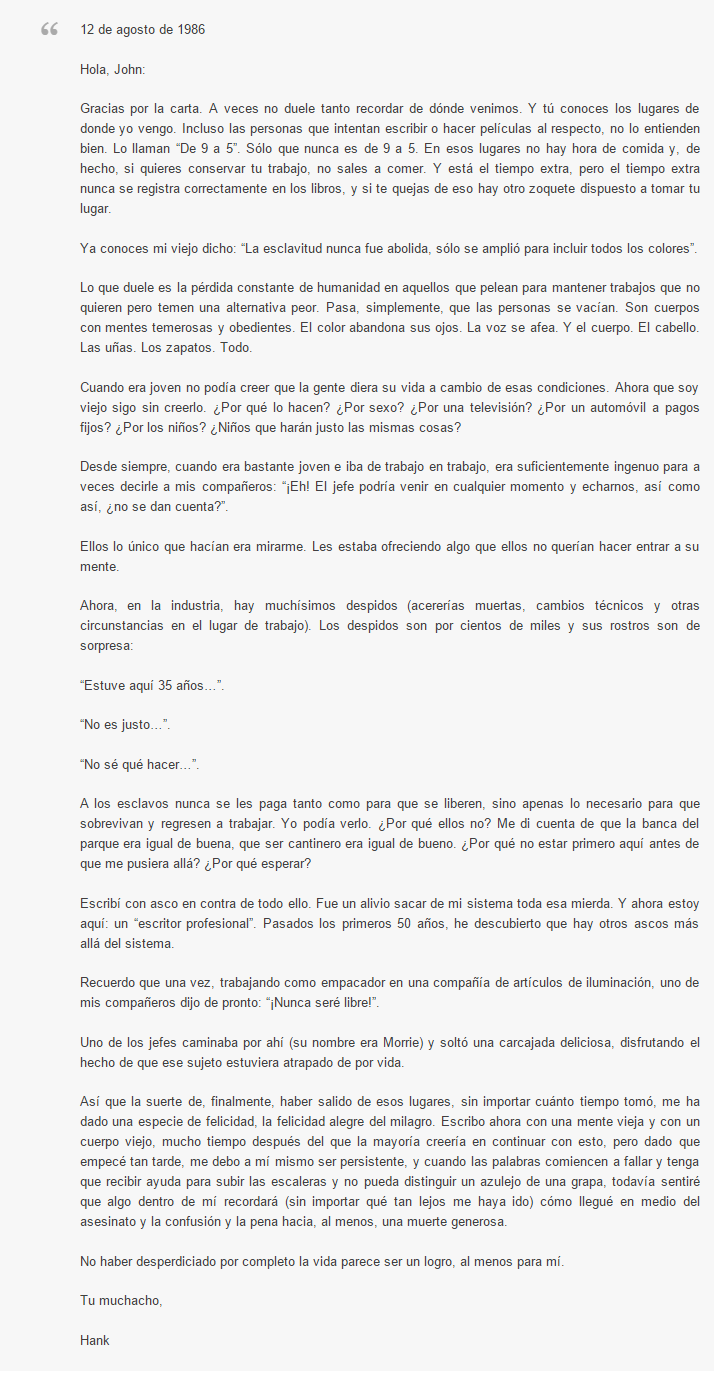 Bukowski, con su seudónimo 'Hank', le escribió esta carta a John Martin, publicista de Black Sparrow Press, quien en 1696 le ofreció 100 dólares al mes para que Bukowski dejara su trabajo como cartero, en el que llevaba casi 15 años, y se dedicara únicamente a escribir. El poeta aceptó y, dos años después, le entregó su primera novela: Post Office.