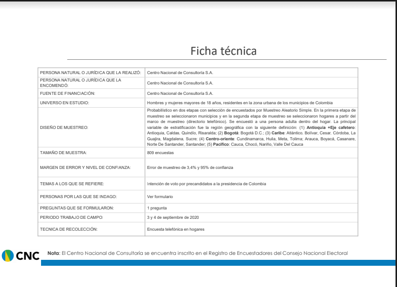 El Centro Nacional de Consultoría midió los posibles candidatos presidenciales para el 2022. De los 12 que ya han hecho pública su aspiración y otros quienes tiene en perfil, resalta el congresista y jefe político de la Colombia Humana Gustavo Petro y Sergio Fajardo. Aunque ambos obtuvieron la intención de voto más alta, sigue siendo bajo aun cuando faltan 2 años para que se atice la contienda electoral. Fajardo tuvo 20% y Petro 16%. Por debajo de ellos está Juan Manuel Galán con 8% y Marta Lucía Ramírez con 6%. Estos fueron los resultados: