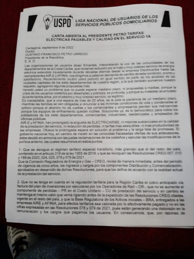 Por esto, las tarifas en la región Caribe son el doble que las tarifas en el resto del país. La USPD pide a Petro, mediante esta carta abierta, que sean modificadas las resoluciones que dieron origen a estas tarifas descomunales. Por ello, se debe echar para atrás el cobro anticipado y la forma en que aumentaron las pérdidas eléctricas, pues los usuarios no son responsables.