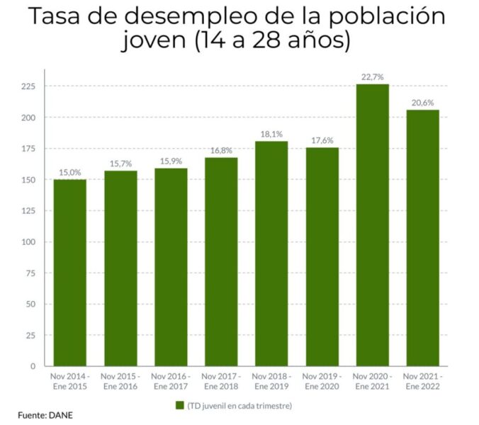 De acuerdo con las cifras publicadas por el Departamento Administrativo Nacional de Estadística (DANE), la tasa de desempleo (TD) para las personas entre 14 y 28 años alcanzó un 20,6% en el trimestre móvil de noviembre de 2021 a enero de 2022.