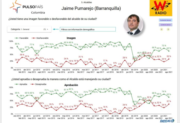 Lo mismo ocurre con el alcalde de Barranquilla, Jaime Pumarejo, quien se desplomó un 10% en su imagen y un 11% en su aprobación.
