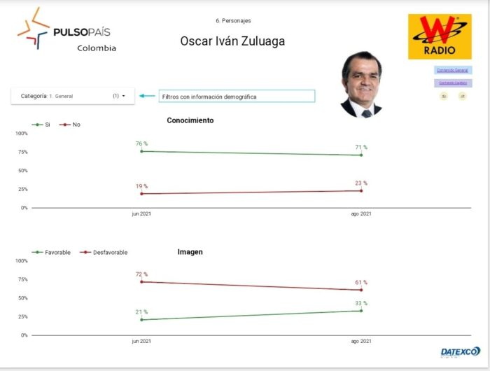 Aunque Óscar Iván Zuluaga sigue teniendo una imagen fuertemente negativa, logró aumentar en 12 puntos su imagen positiva en un mes, que coincide con la confirmación de su aspiración presidencial.