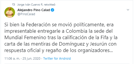 Al final Colombia no tuvo la sede del Mundial Femenino que se realizará en el 2023. La FIFA se decidió por dársela a Australia y a Nueva Zelanda en una sede conjunta. A pesar de la expectativa Colombia nunca tuvo opciones reales. Las mentiras que le intentaron meter a la FIFA de que acá se apoyaba el fútbol femenino y habían más de 20 mil jugadores inscritas en el profesionalismo, eran absurdas. Por eso Alejandro Pino Calad, tal vez el periodista deportivo más importante del país, despellejó la situación y de manera descarnada explicó por qué Colombia no podía ser la sede de un Mundial de fútbol: