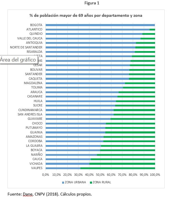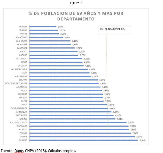Del total de personas por departamentos, la mayor proporción de mayores de 69 años residen en Quindío, Caldas, Tolima, Boyacá, Risaralda, Valle del Cauca, Nariño, Santander, Antioquia y Cundinamarca, concentrando el 53,6 % del total de la población de este grupo de edad; esto es siete puntos porcentuales más de lo que representa la población total de estos departamentos dentro del total poblacional del país (ver Figura 2).