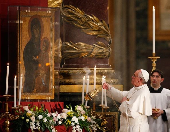 En la basílica, donde reposan siete papas, está el icono mariano más importante, la Salus Populi Romani. La tradición atribuye la imagen a San Lucas, evangelista y patrón de los pintores.