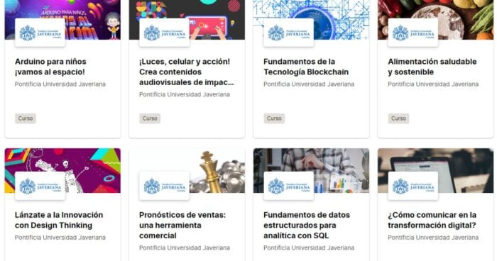 La Javeriana incluye un amplio listado de cursos en temas como datos personales, ciencias sociales, comunicación social, desarrollo sostenible, administración de empresas, artes visuales, salud pública, entre muchos otros más.