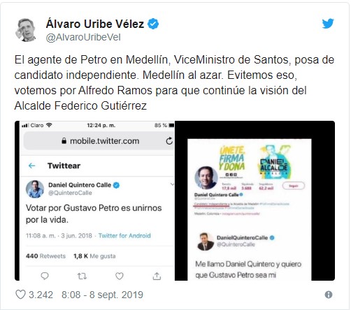 La esposa del candidato a la alcaldía de Medellín Daniel Quintero salió al paso de los señalamientos que el expresidente le está haciendo con este duro trino