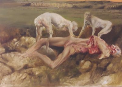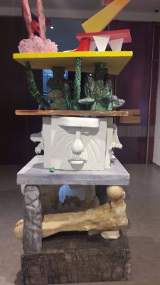 Cadáveres o restos de basura en la única composición de lugar: un televisor viejo y siniestro atravesado por palos es el sinónimo de la triste realidad. La comunicación se encuentra manipulada. Nada nuevo. Una caja llena de basura actual que por detrás muestra la tumba de una antigua momia. Nada nuevo. Unos zapatos con tacones que tienen pies de caballo es una anomalía antifeminista. Un esqueleto realizado entre un mico y un hombre es la teoría de Darwin pero el resultado del cadáver no es nada estético. Trofeos de cacería en varios estantes es una recolección ridícula de animales disecados. Un tótem inaudito que recolecta imágenes de todos los tiempos es una bazofia conceptual que no une ideas sino que dispersa el pensamiento. Unas “cabezas reducidas” que venden en el 20 de Julio son las momias modernas que las intervienen con costura actual. Una vitrina que reúne piezas de pedazos sueltos como perros silla, manos inertes, esferas inútiles, arañas desgastadas por su símbolo, piedras talladas –y me faltan más objetos insólitos- son el descreste de un intelectual sin rumbo.