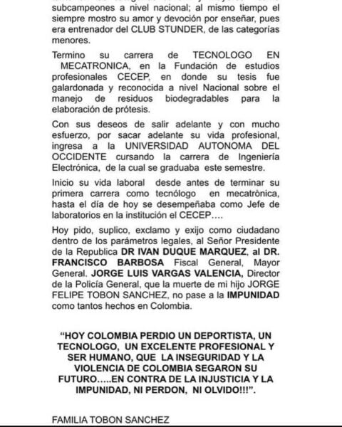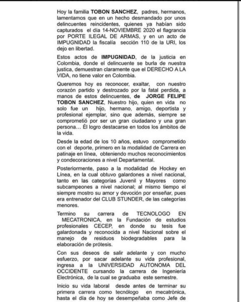 Felipe tenía un hermano menor, Juan Esteban, y vivían con su madre María del Pilar y su padre Fredy Mario, un sargento retirado del ejército nacional. La familia entera, en medio de la tragedia, se pronunciaron con un contundente comunicado publicado desde la cuenta de Instagram de su hijo fallecido.