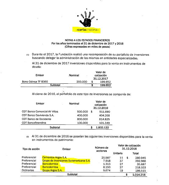 Y, al mismo tiempo, se halló en documentos oficiales que la fundación realizaba inversiones en empresas como Bancolombia, Cementos Argos S.A., Grupo de Inversiones Suramericana S.A. y Grupo Argos S.A.