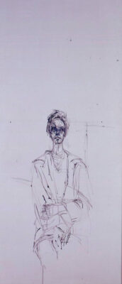 Alberto Giacometti estudió en París y su gran mentor y profesor fue Antoine Burdelle quien, a su vez, fue asistente de August Rodin. Giacometti vivió las dos guerras mundiales y aprendió de la fugacidad del ser humano. De lo posible y lo imposible que se vive entre la vida y la muerte. En París, conoció a su esposa Annete Arm que fue su otra paciente modelo. Lo mismo que Merlín su perro quien los acompañó su tiempo. (Acá en Bogotá en el Museo Botero tenemos uno de sus bellos retratos de Annete). Son dibujos que se parecen a las esculturas porque no sabemos dónde termina y dónde acaba la creación.