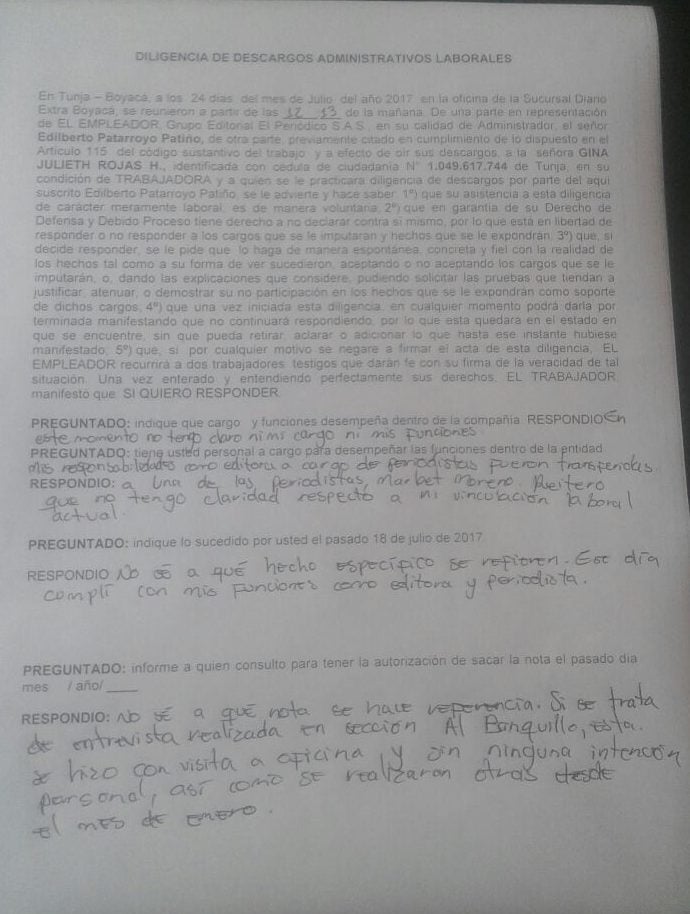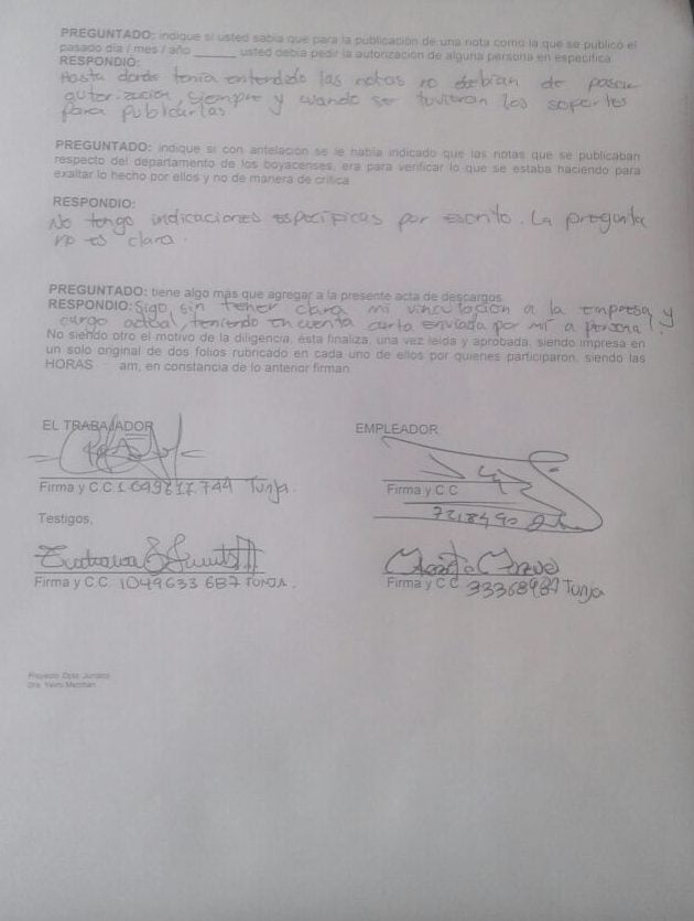 Teniendo en cuenta que estampar mi rúbrica en dicho documento era aceptar realizar un periodismo acomodado favoreciendo al Gobernador, en contra de mis convicciones y ética, me negué a firmarlo. Al día siguiente, 20 de julio, por no firmar el documento me solicitaron mi carta de renuncia que también me negué a presentar, ante lo cual decidieron consultar con el gerente nacional y me informaron que mi contrato iría hasta el 30 de julio con las funciones como editora general de EXTRA Boyacá.