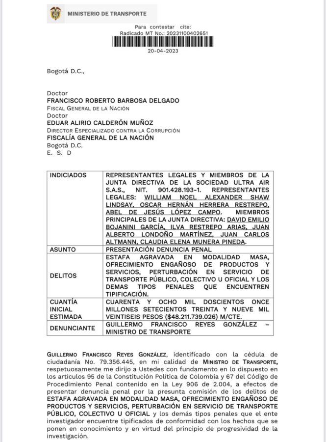 La denuncia del ministro saliente ante la Fiscalía es contra los representantes legales Wlliam Noel Alexander Shaw, CEO y dueño de Ultra Air; Óscar Hernán Herrera Restrepo y Abel de Jesús López Campo y los miembros principales de la Junta Directiva de la aerolínea, David Emilio Bojanini García; Ilva Restrepo Arias; Juan Alberto Londoño Martínez; Juan Carlos Altmann y Claudia Elena Múnera Pineda.