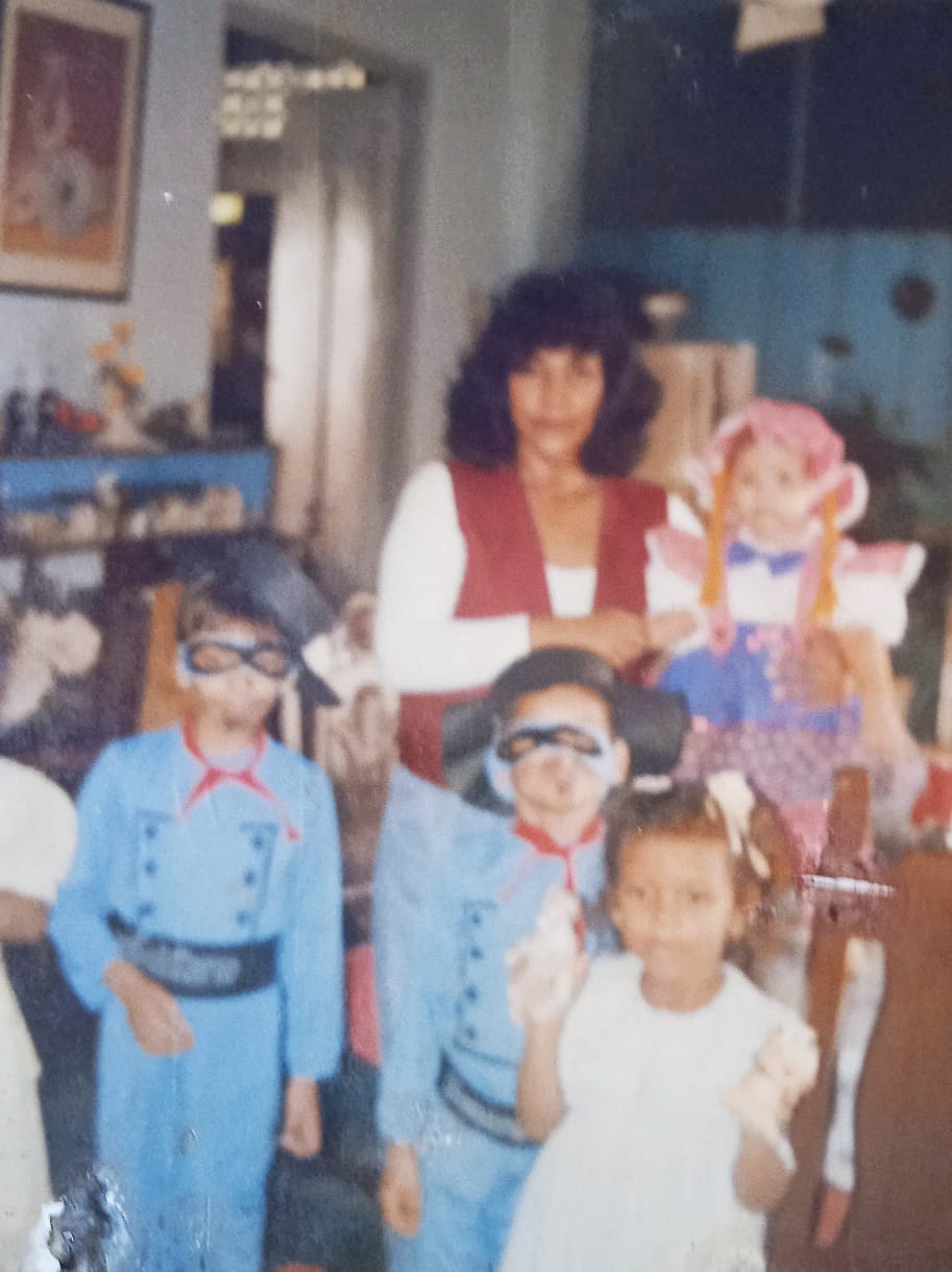 Iván Meneses con su hermano Régulo, disfrazados del llanero solitario. Su madre Nilsa De Meneses, cargando a su hermana menor Maité, quien luce un disfraz de muñequita, y al lado suyo se encuentra su amiga, Marolys Núñez Muñoz. 31 de octubre 1994.