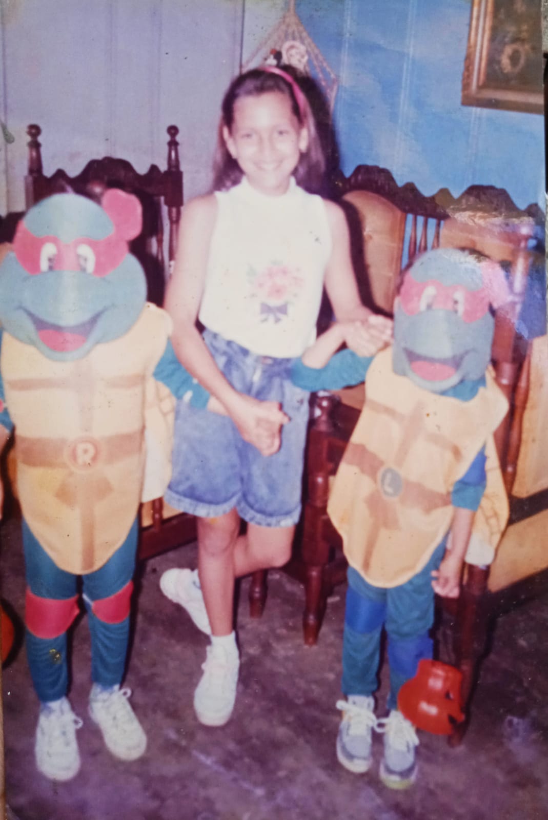 Iván Meneses con sus hermanos Cindy y Régulo, disfrazados de las tortugas Ninjas. Halloween, octubre 31 de 1992