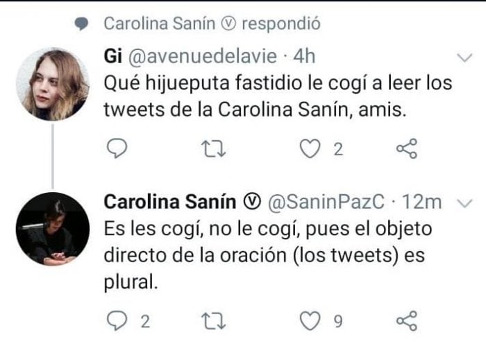 Una usuaria de Facebook, sin etiquetarla, dice que le cogió fastidio a leer los tuits de Carolina Sanín. Ella, seguramente porque uno de sus muchos sapos la etiquetó en el tuit, le responde a la usuaria no diciendo algo sobre el tuit, sino atancándola porque escribió le cuando era les. Para Carolina el objeto indirecto era «los tuits» y no «a leer».