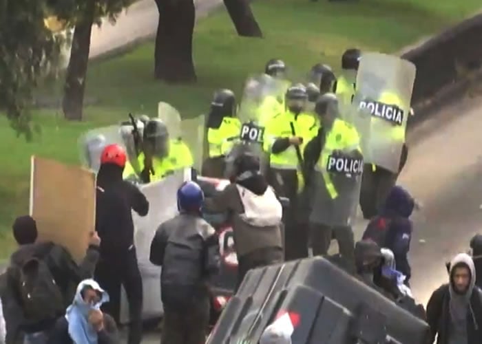En medio de la reactivación de las protestas en Colombia, circula un vídeo en redes sociales en el que se ve a un grupo de policías en una batalla campal contra las piedras y ladrillos que lanza delincuentes que empañan con violencia la reactivación de las marchas que suceden en Bogotá.