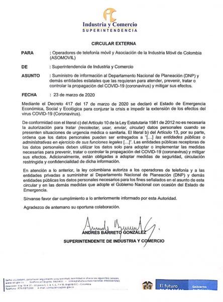 El Superintendente de Industria y Comercio, Andrés Barreto, le solicitó a los operadores de telefónica móvil el suministro de la información de datos personales de los colombianos al Departamento Nacional de Planeación y demás entidades estatales para atender, prevenir, tratar o controlar la propagación del COVID-19.