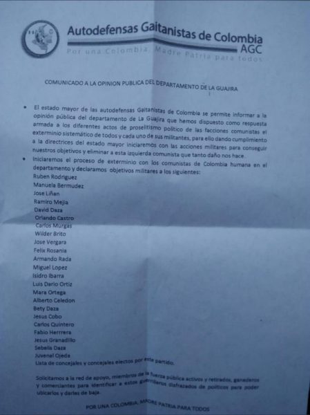 A pocos días del asesinato de tres lideres de la Colombia Humana en Colombia, diferentes personalidades políticas denuncian desde sus redes sociales un panfleto amenazante con la firma de las Autodefensas Gaitanistas de Colombia, en el que se declara objetivo militar a todos los políticos afiliados al partido político de Gustavo Petro en el departamento de la Guajira.