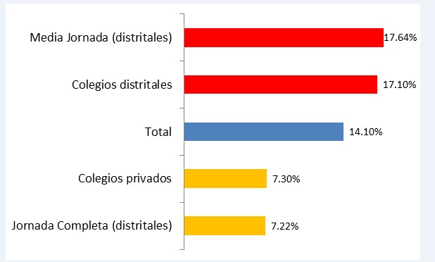Tengo que resaltar que mientras que solo el 7.2% de los estudiantes de los colegios distritales, que asisten a jornada completa, reportan haber visto venta de drogas al interior del colegio, en las instituciones de medias jornadas el porcentaje aumenta en más de 10 puntos. La cifra alcanza el 17,6%. En este sentido, es claro que la jornada completa o única sería una estrategia fundamental en la prevención del tráfico de drogas al interior de los colegios.