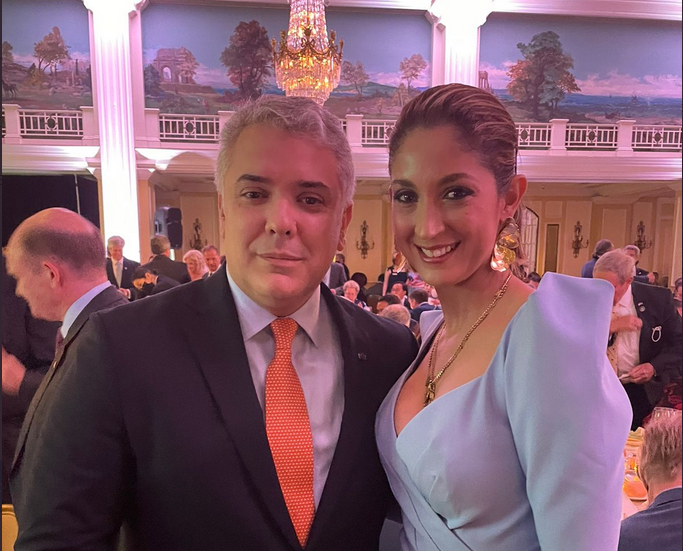 Iván Duque junto a la presidenta de la Cámara, Jennifer Arias, quien lo acompañó en la gala de premiación de la ICCF en la que el presidente fue condecorado por su compromiso con el medio ambiente. Foto: @JenniferAriasF
