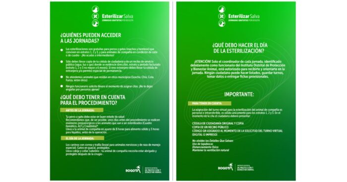 El Instituto Distrital de Protección y Bienestar Animal (IDPYBA) de Bogotá, abre constantemente inscripciones para las jornadas de esterilización a perros y gatos de forma completamente gratuita. Esterilizar es una medida de salud bastante importante, además, en hembras se evita el cáncer en el aparato reproductor y en machos se evitan embarazos no deseados a otros animales y así el aumento de caninos en las calles.
