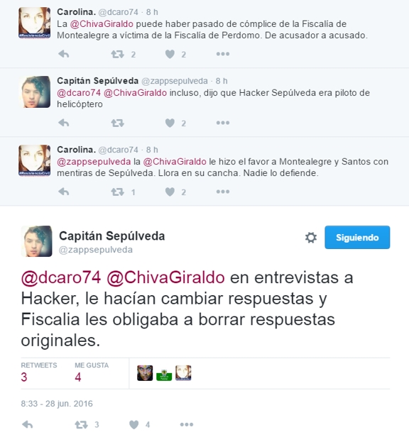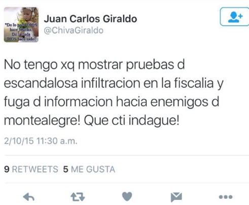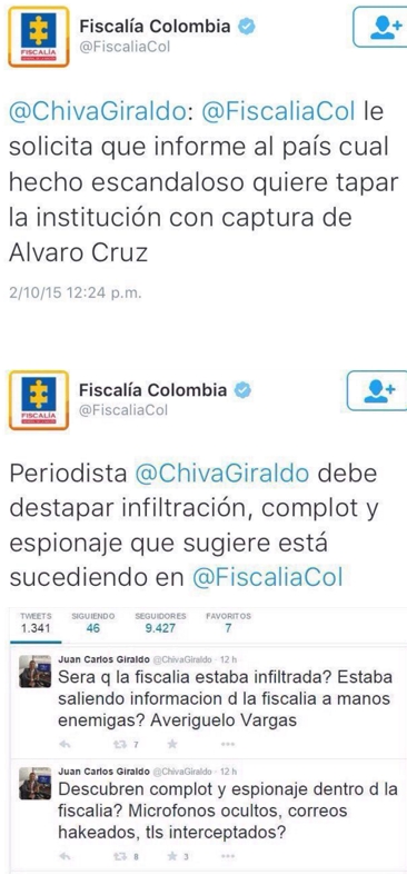 Conversé con Juan Carlos Giraldo esa noche. Me contó que le había hablado en un tono desobligante y amenazante. La llamada se había originado en respuesta a una serie de trinos en los que el periodista Giraldo ya había marcado su distancia y comenzaba a mostrarle los dientes al fiscal Montealegre denunciando que la Fiscalía estaba siendo objeto de una infiltración por parte de los detractores del su administración. Esa misma noche la institución le contestó desde su cuenta oficial al periodista instándolo a que presentara las pruebas de sus afirmaciones.