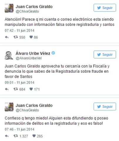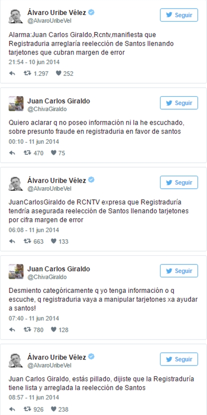 En vísperas de la campaña de reelección de Juan Manuel Santos en 2014, Uribe aseguró en su cuenta de Twitter que el periodista Juan Carlos Giraldo tendría información sobre la Registraduría y un posible fraude para favorecer a Juan Manuel Santos en las siguientes elecciones.