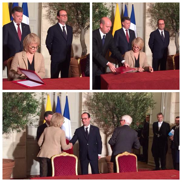 Esta vez el Presidente viajó acompañado por cinco ministros y algunos invitados más. Lo acompañan los ministros Mauricio Cardenas, Aurelio Iragorri, Gina Parody, Cecilia Álvarez, Mariana Garces y la canciller Holguín. Están también el expresidente Cesar Gaviria, el rector de la Universidad Externado Juan Carlos Henao, la directora de artesanías de Colombia Aida Furmanski con el embajador Federico Renjifo y su esposa Catalina Crane como anfitriones. El Presidente y sus ministros se hospedan en el tradicional hotel Bristol en París. El lunes comenzó su visita oficial con un encuentro con el Presidente Francois Hollande con quien tiene una cena privada en el Palacio del Elíceo. Aprovechará el viaje para pasar revista a la situación de Colombia frente a su ingreso a la Ocde, por lo cual se entrevistará con el secretario de la organización el mexicano Ángel Gurría. El último acto será colocar una ofrenda floral en la Plaza Republique como gesto de solidaridad con las víctimas de los atentados contra la revista Chalie Hedbo. Anuncios. Anuncios..