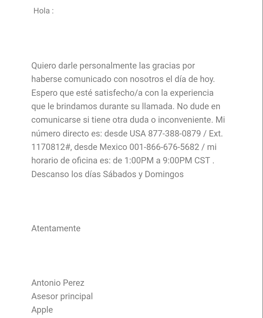 Recibí un correo donde decía que "me agradecían por comunicarme con ellos" y que están al tanto del proceso, que cualquier cosa me comunique con ellos, el mail lo firma Antonio Pérez, quien en un correo posterior (aunque dijo que me iba a llamar) me dijo que estaría fuera de la oficina y que hablara con su supervisor para que le transfieran el caso a otra persona.