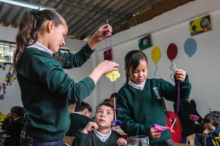 Son las 6:30 a.m. y ya hay movimiento en la edificación de color azul de la vereda Arrayanes Bajo de Usme. Ataviados con ruanas para hacerle el quite al gélido frío de la montaña, Jackeline Poveda, Yaneth Luengas y Jairo Prieto, reciben con cálidas sonrisas a sus 49 estudiantes que corren a saludarlos. Están felices, pues saben que hoy harán los adornos de la fiesta en donde podrán jugar y divertirse.