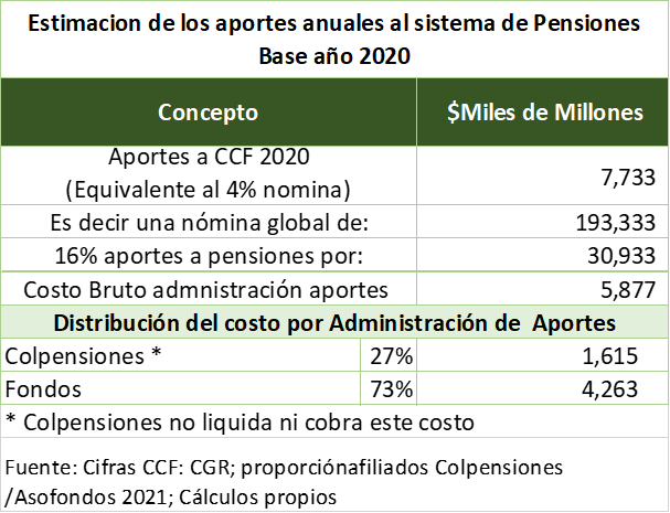 Una estimación de las cifras involucradas en este “negocio”, parten de los aportes a Cajas de Compensación Familiar. En el año 2020 el monto fue cercano a $7.7 billones. Ello permite estimar el monto de los pagos por nómina de alrededor de $190 billones. Por ende, un aporte del 16% (por pensiones) cercano a los $31 billones, el 19%, porcentaje de descuento efectivo establecido previamente indica que el costo bruto a cargo de los aportantes ronda los $5.8 billones año.