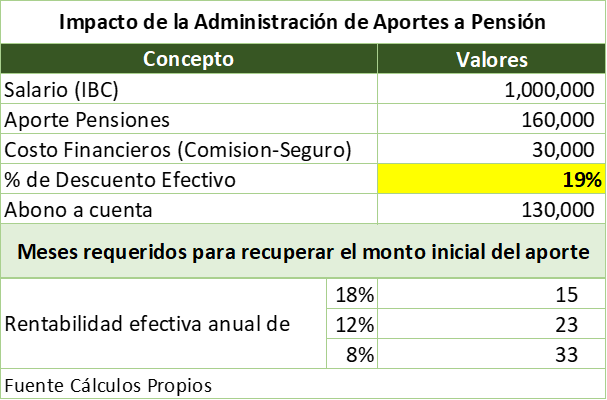 El aporte a pensiones equivale a $160.000 mensuales. Las comisiones y costos financieros aplicados no sobre el aporte sino sobre el salario, bien puede ser de 3% facial, pero es del 19% efectivo sobre el monto del aporte.