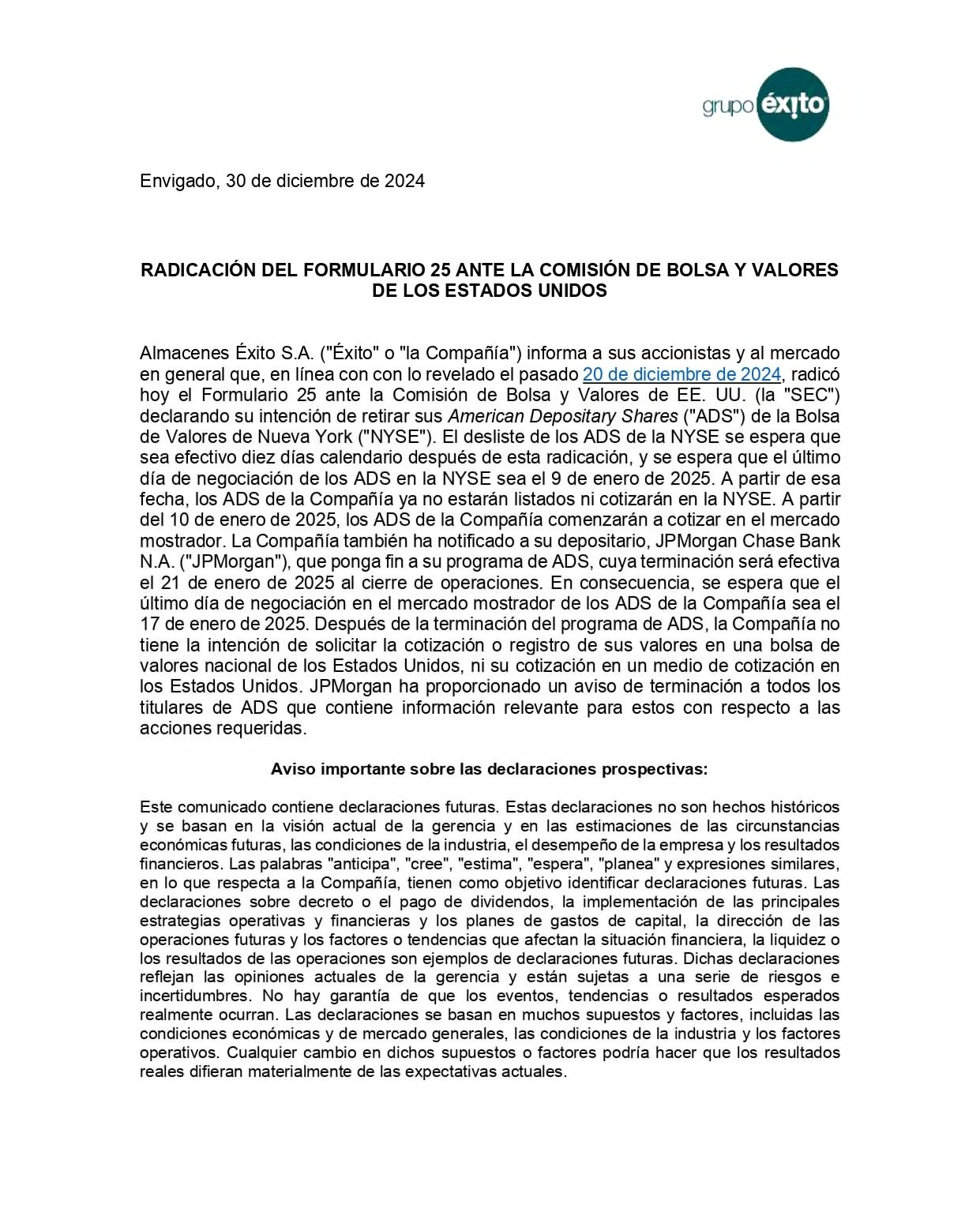 El Grupo Éxito arrancó el proceso para retirar sus acciones listadas en la Bolsa de Valores de Nueva York que sería efectivo para el 10 de enero de 2025. Diez después, por solicitud del Grupo, JPMorgan también finalizará su programa de ADS. La decisión de la salvadoreña familia Calleja, recientes dueños del Éxito, la tomaron como parte de una nueva estrategia que se vislumbra para el próximo año con el fin de que la cadena de almacenes de ventas al detal se fortalezca en el país donde cuenta con 500 tiendas.