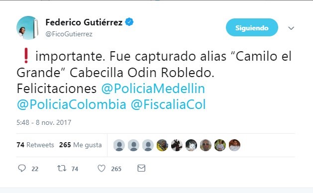 Pero sin duda el orgullo mayor del alcalde Federico Gutiérrez es la caída de los grandes capos que se ha ido dado, progresivamente desde que su posesión. Ha corrido riesgos, viéndose obligado a reforzar el esquema de seguridad, pero se ha apoyado básicamente en la ciudadanía incorporando a la gente activamente a través de las redes sociales, con grupos de WhatsApp por cuadrantes, de Facebook y Twitter conectados con las autoridades de policía de la ciudad pero incluso con él mismo.