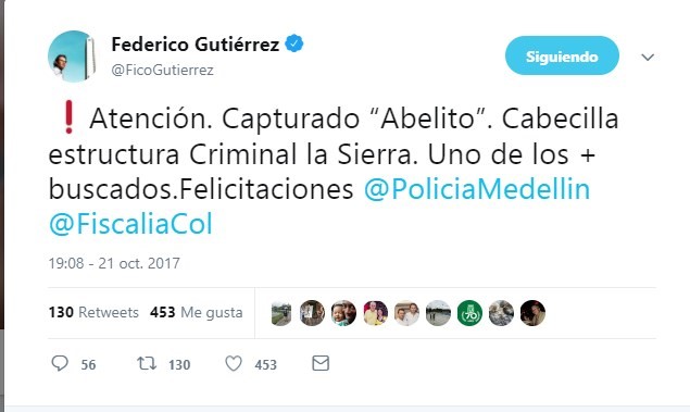 El 21 de octubre del 2017, Abel Andrés Garcés Londoño, por el que se ofrecía una recompensa de $20 millones, cayó en Medellín. Desde el 2010 lideraba la mítica banda de La Sierra a quien convirtió en una filial del Clan del Golfo y que domina los barrios La Sierra, Villa Turbay, Villa Liliam y las Estancias, todas de la comuna 8 de Medellín. El alcalde también dio su parte de tranquilidad y las felicitaciones después de la captura.