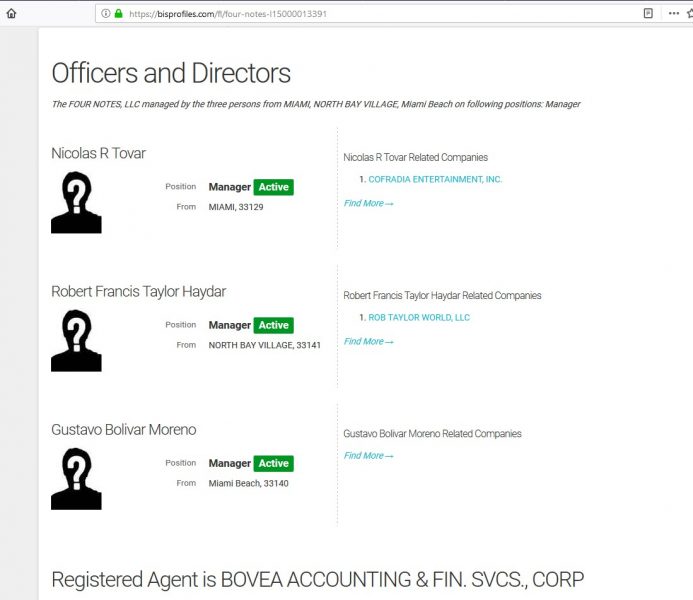 La sociedad Four Notes LLC fue creada el 22 de enero del 2015 y comparte la dirección que comparte con sus amigos Nicolás Tovar y Rober Taylor