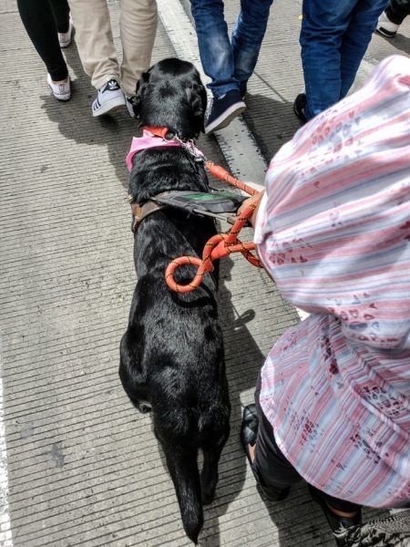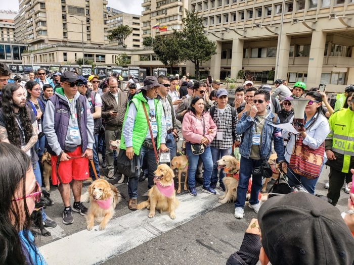 La promotora de la marcha fue Lida Carriazo, hermana del actor Enrique. Ella tiene su perro y ha sufrido la discriminación en primera persona. A las 11 de la mañana arrancó la marcha. La Alcaldía de Bogotá estuvo presente. Muy presente. Unas 30 personas con su respectiva chaqueta azul hicieron énfasis en el respaldo del alcalde Enrique Peñalosa a la marcha y los derechos de las personas con discapacidad visual. Pero con el transcurso del tiempo, la incomodidad de algunos asistentes a la marcha fue aflorando: “Nos gritan como si fueramos niños pequeños”, “no saben que no pueden tocarnos, ni el hombro ni nada” nos quieren llevar como si fuéramos un rebaño de ovejas”. Eran demasiados representantes del Distrito, pero a casi todos les faltaba formación en temas de discapacidad visual.