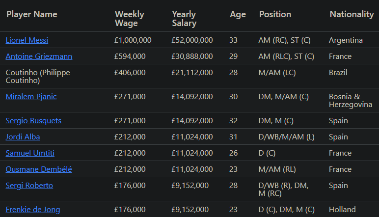 Messi ganaba 52 millones de libras anuales en Barcelona, lo que equivale a 61 millones de euros. Via www.salarysport.com