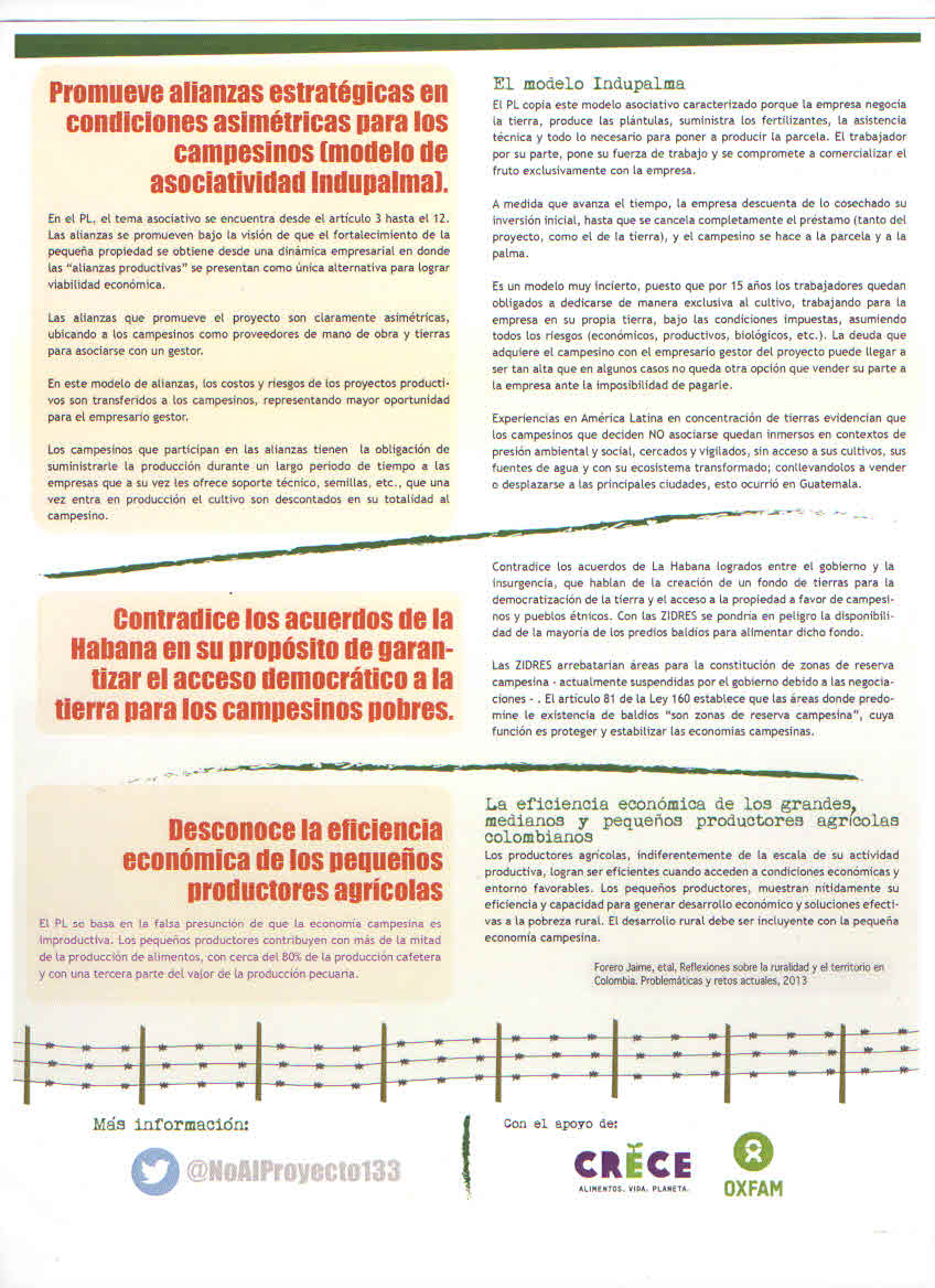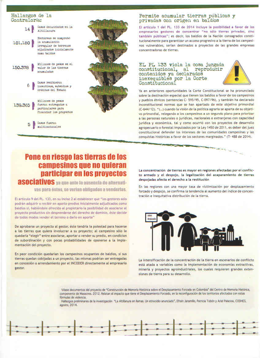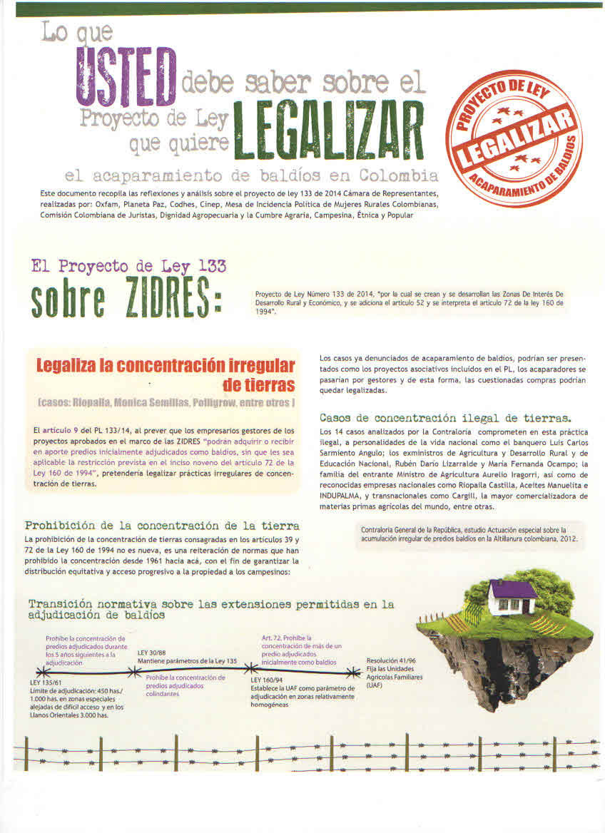 Pero además, organizaciones sociales han prendido las alarmas, porque han entendido que se trata de un nuevo intento de legalizar los métodos irregulares de acaparar los baldíos, tierras del Estado que desde 1936 están destinadas a los campesinos pobres. Consideran que a través de esta ley se sanean prácticas cuestionadas como las que los abogados de Brigard y Urrutia ingeniaron para que la empresa Ríopaila Castilla pudiera eludir la restricción legal de adquirir más de una Unidad Agrícola Familiar, área máxima que puede comprar un particular cuando se trata de baldíos adjudicados a campesinos. Lo hicieron a través de la constitución de 27 sociedades anónimas simplificadas que compraron 42 mil hectáreas en Vichada.