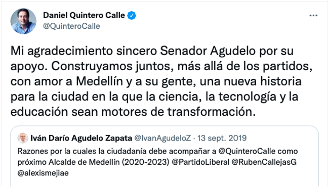 Con la salida de Hincapié de la rectoría, Iván Agudelo tomó mucha más fuerza dentro de la universidad y movió ese apoyo hacia el alcalde Daniel Quintero. El senador liberal se la jugó políticamente apoyándolo en campaña cuando buena parte del liberalismo local ya se había decidido por Alfredo Ramos. Fue él quien lo llevó nuevamente a Medellín y lo dio a conocer después de que Quintero hiciera carrera en Bogotá de la mano de David Luna. La apuesta de Agudelo dio sus frutos e incluso fue el único político que se subió a la tarima de Quintero cuando ganó las elecciones en 2019.