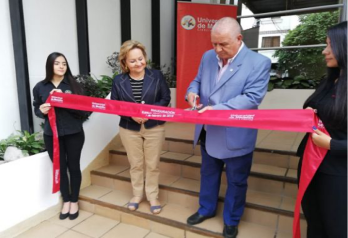 En febrero de 2019 la concejal Aura Marleny Arcila con su pareja el entonces rector Hincapié en la inauguración de una sede de la U. Foto Universidad de Medellín.