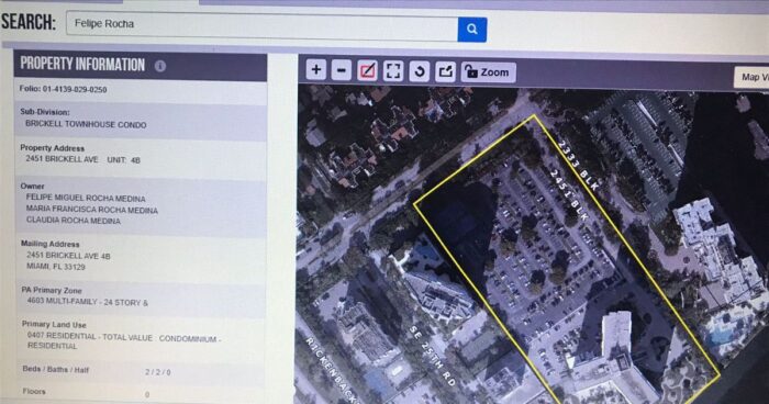 También hay bienes en el exterior que, como lo demostró la Superintendencia de Sociedades en el caso de Estraval, no son inalcanzables. Una consulta en la página oficial de Miami Dade, que incorpora un registro de bienes, les ha servido para confirmar que Felipe Rocha, su mamá y su hermana Claudia Rocha Medina tienen un apartamento situado sobre la Avenida Brickell, condominio Townhouse. La propiedad fue construida en 1963 y está avaluada en US$305.000.