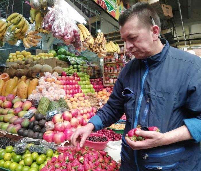 Un paseo vallenato suena y colabora armoniosamente con los contrastes que ofrecen las frutas y las verduras, dándole al paisaje un ambiente de campo. “Don Juvenal”, santandereano, delgado y ágil. Sostiene una bandeja llena de fresas. Le pido que me regale una foto y le explico mi deseo de escribir sobre él, sobre su trabajo. Accede. Me dice que tiene más de veinte años trabajando con frutas, verduras y hortalizas. Me regala una sonrisa y se despacha en elogios hacia la plaza “Estoy agradecido. En ocasiones llego sin plata y me voy con plata. He podido pagar la universidad de mis hijos gracias a este puesto, en el que ya tengo más de veinte años”.