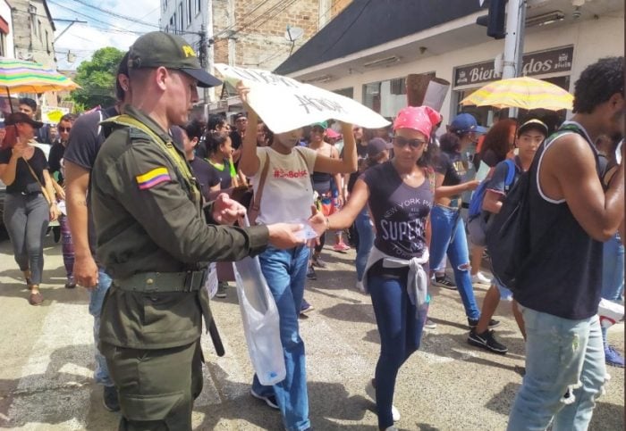 La marcha en Apartadó ha sido ejemplar. Esta foto evidencia la manera pacífica en la que se ha llevado a cabo la jornada de protesta. El ejército y la policía, que tantos cuestionamientos han recibido en esa convulsionada zona, han protagonizado uno de los capitulos más conmovedores este 21 de noviembre, han ayudado a mitigar el calor dándole agua a los manifestantes: